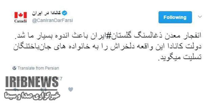 کانادا هم اعلام کرد؛ انفجار معدن ذغال سنگ گلستان ایران باعث اندوه بسیار شد. دولت کانادا این واقعه دلخراش را به خانواده های جان باختگان تسلیت می گوید.