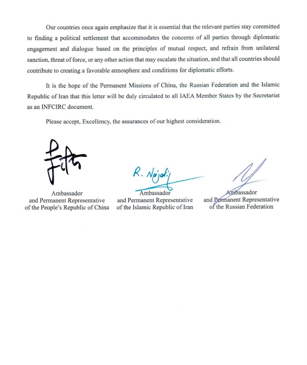 به گزارش خبرگزاری صدا و سیما، در ادامه تلاش‌های دیپلماتیک جمهوری اسلامی ایران در خصوص خاتمه اجرای قطعنامه ۲۲۳۱، نمایندگان دائم سه کشور ایران، روسیه و چین نزد آژانس بین‌المللی انرژی اتمی، روز جاری در نامه‌ای مشترک خطاب به «رافائل گروسی» مدیرکل آژانس، بر پایان همه مفاد این قطعنامه تأکید کردند.