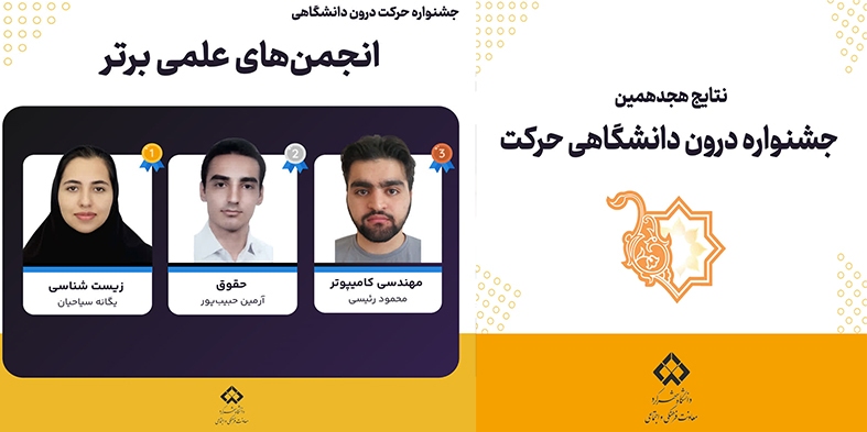 در پایان انجمن علمی دانشجویی کارآفرینی، انجمن علمی دانشجویی کارآفرینی، انجمن علمی دانشجویی زیست‌شناسی، انجمن علمی دانشجویی زیست‌شناسی، انجمن علمی دانشجویی حقوق و انجمن علمی دانشجویی مهندسی کامپیوتر رتبه‌های برتر را کسب کردند.